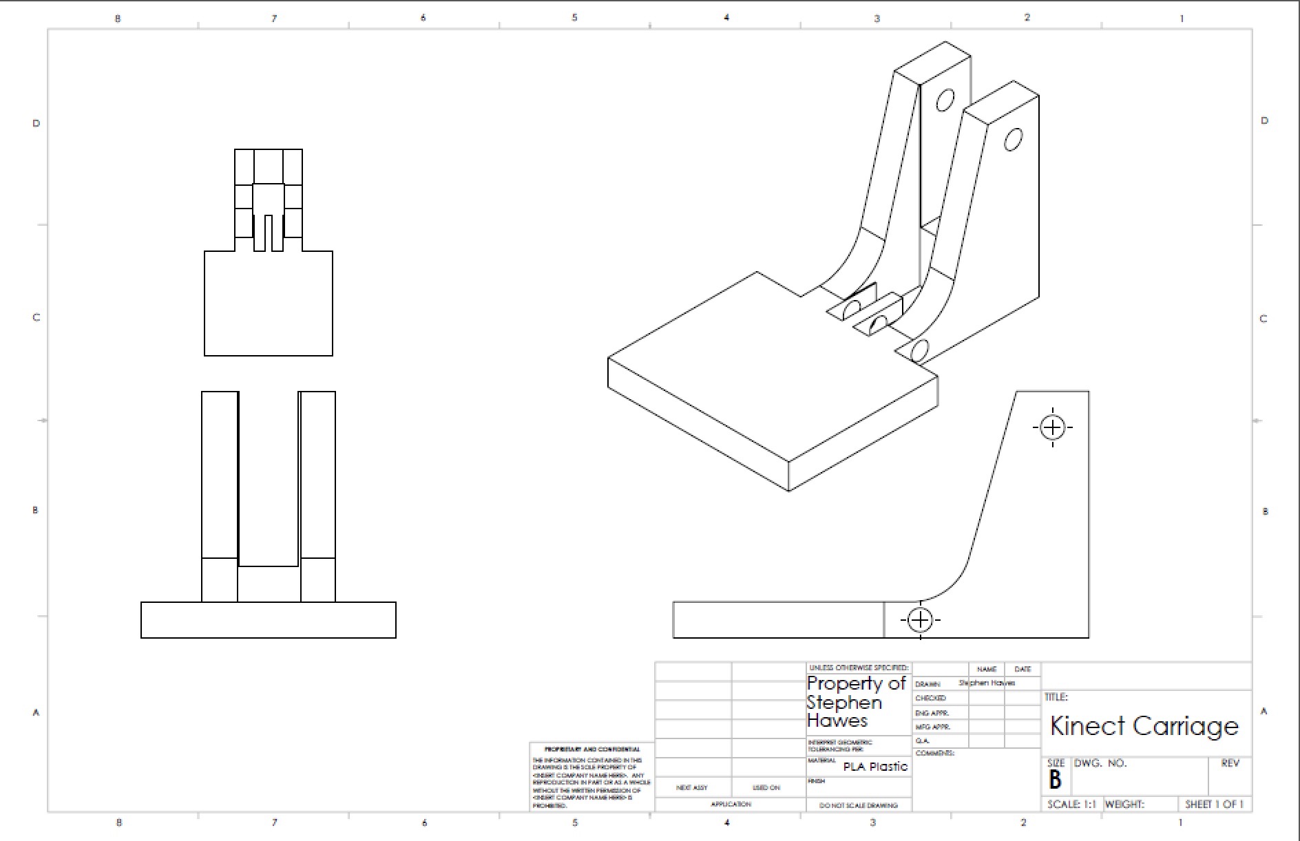 First up was designing the carriage to carry the Kinect. It had to be able to slide along a 20mm x 20mm aluminum extrusion with little to no friction, but also be sturdy enough to not botch a scan due to tracking loss. After going through a few design iterations, I settled on a design.